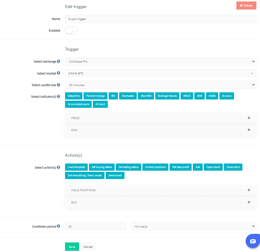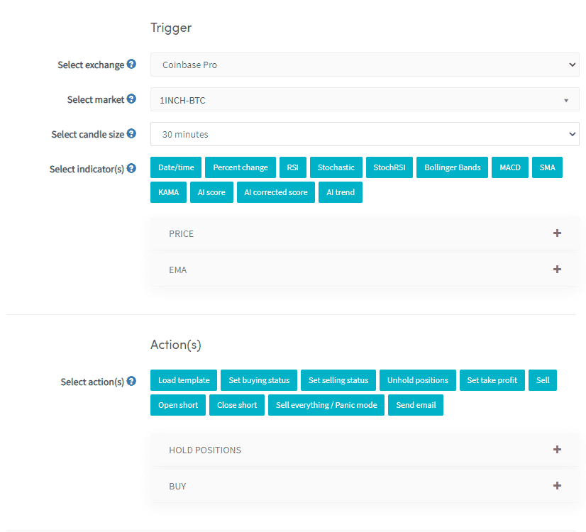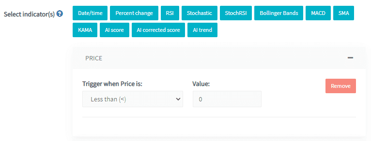 Define when your trigger should take action. Get in action after a price change, or even use technical indicators to start the trigger.